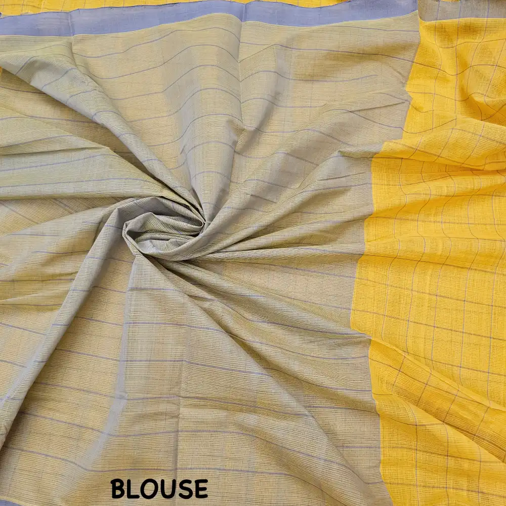 This Yellow Mangalagiri Cotton Checks Saree showcases timeless elegance with its traditional Red checked weaving pattern. The saree comes with a striking Light Blue contrast border, blouse, and pallu that enhance its overall appeal. Featuring the signature “line missing” weaving technique unique to Mangalagiri craft, this saree is lightweight, breathable, and perfect for all-day comfort. An ideal choice for both casual and festive occasions.