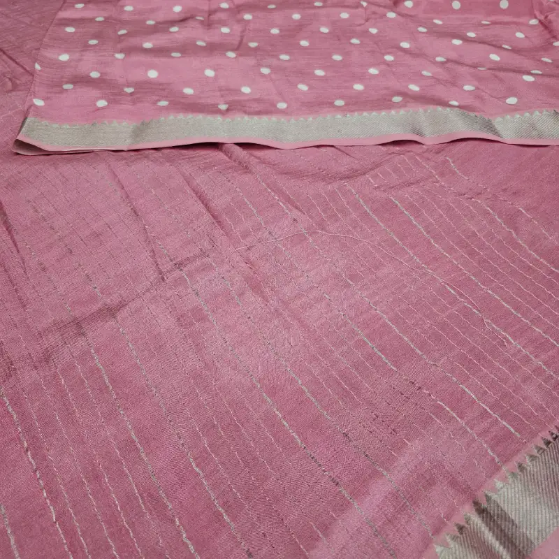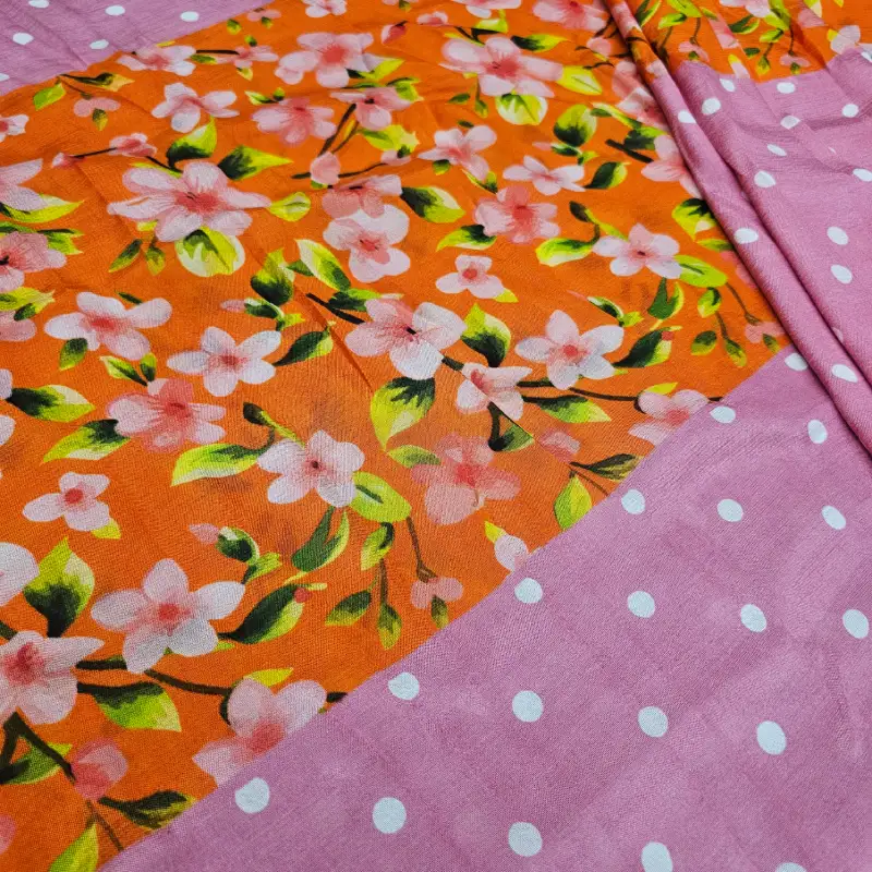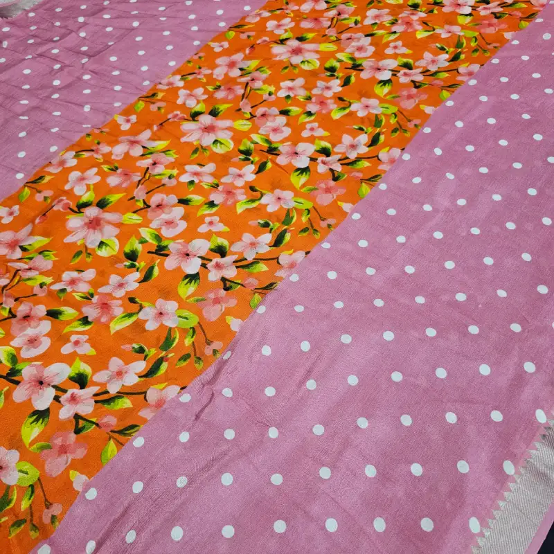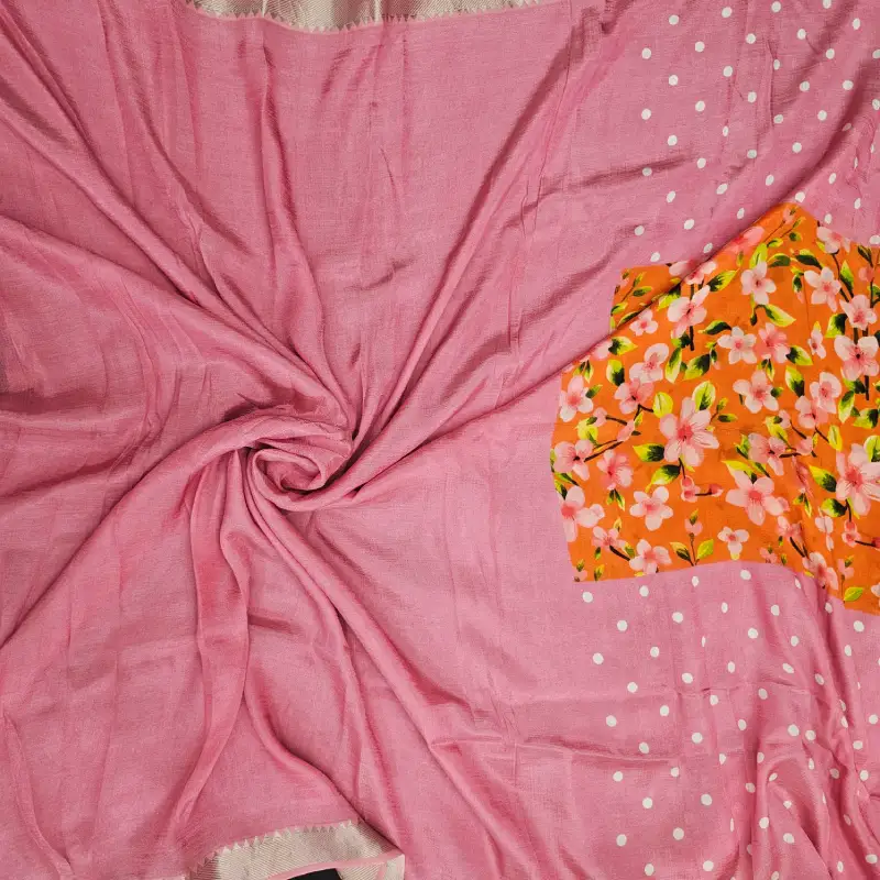 Elegant Rose Pink and Orange Mangalagiri Handloom Silk Cotton Blend Bandhani Saree with beautiful digital print work. The saree features a rich Zari-Striped Pallu for a festive look and comes with a Plain Rose Pink Running Blouse, making it a perfect blend of tradition and style. Ideal for festive occasions, weddings, and celebrations.