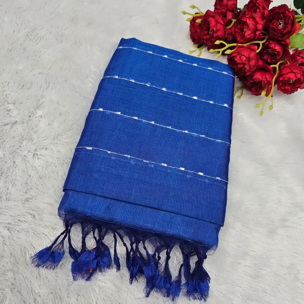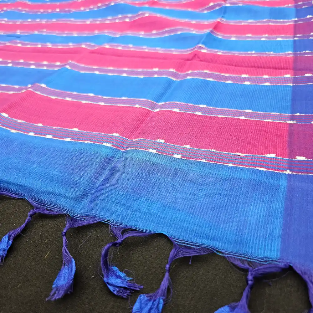 The Royal Blue And Purple Mangalagiri Handloom Silk Cotton Blend Jute Lines Saree, is a perfect fusion of traditional weaving and modern elegance. Crafted with a fine cotton-silk blend, it features distinctive jute line patterns that lend a rich texture and contemporary appeal. Lightweight and graceful, this saree is ideal for festive occasions, formal gatherings, or everyday ethnic elegance.