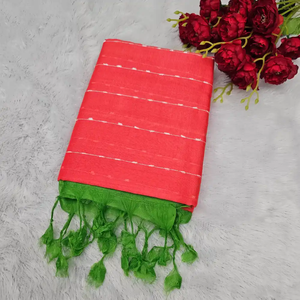 The Tomato Pink And Green Mangalagiri Handloom Silk Cotton Blend Jute Lines Saree, is a perfect fusion of traditional weaving and modern elegance. Crafted with a fine cotton-silk blend, it features distinctive jute line patterns that lend a rich texture and contemporary appeal. Lightweight and graceful, this saree is ideal for festive occasions, formal gatherings, or everyday ethnic elegance.