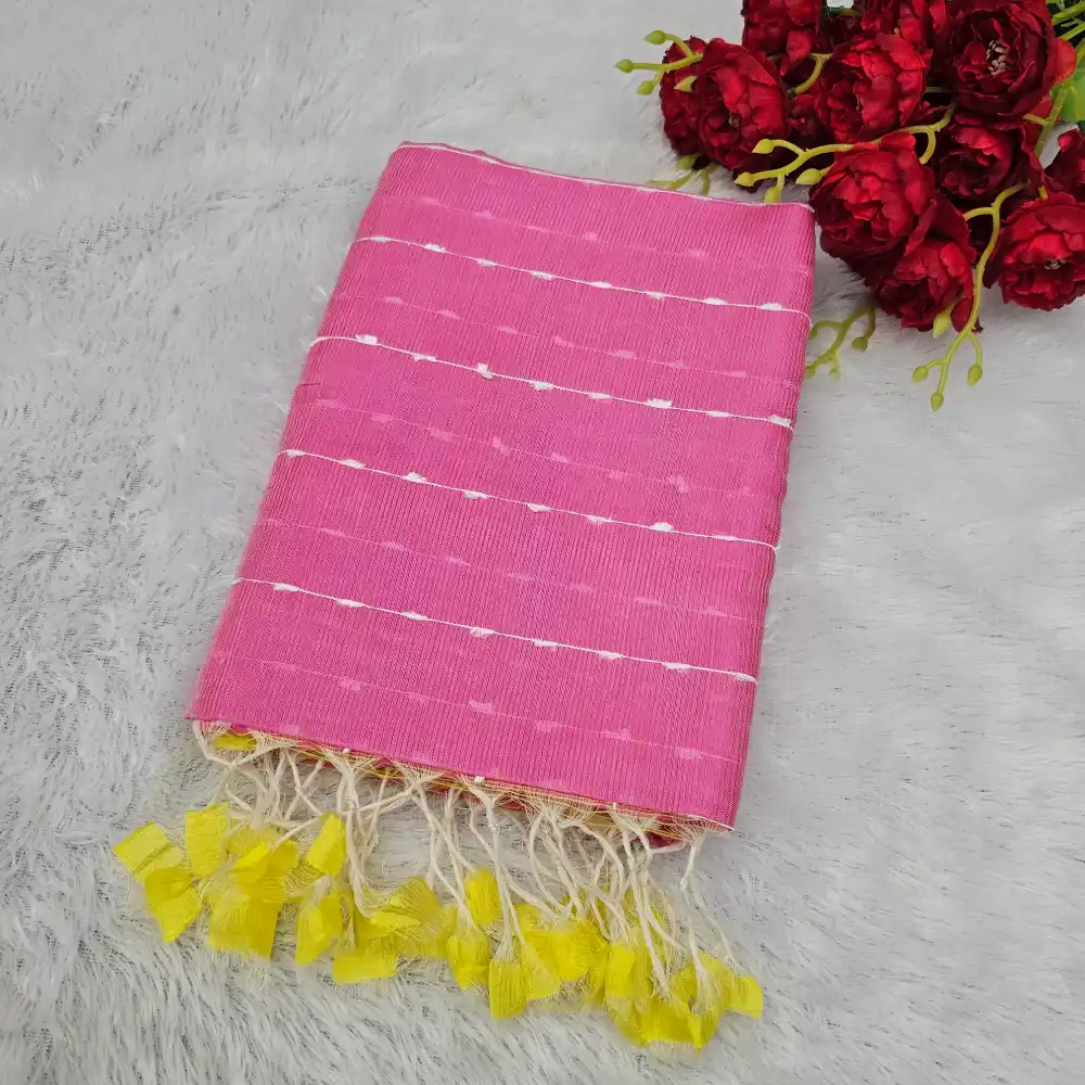 The Baby Pink And Yellow Mangalagiri Handloom Silk Cotton Blend Jute Lines Saree, is a perfect fusion of traditional weaving and modern elegance. Crafted with a fine silk-cotton blend, it features distinctive jute line patterns that lend a rich texture and contemporary appeal. Lightweight and graceful, this saree is ideal for festive occasions, formal gatherings, or everyday ethnic elegance.