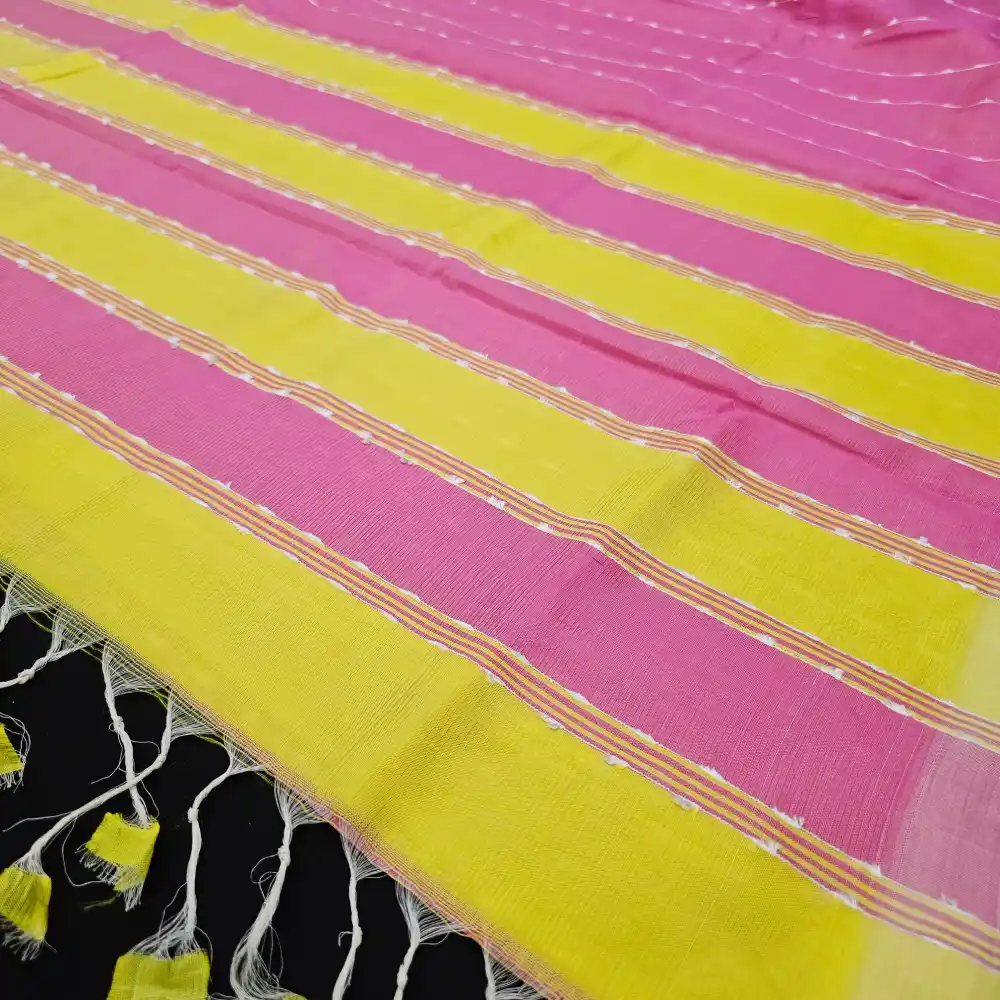 Baby Pink And Yellow Mangalagiri Handloom Silk Cotton Blend Jute Lines Saree