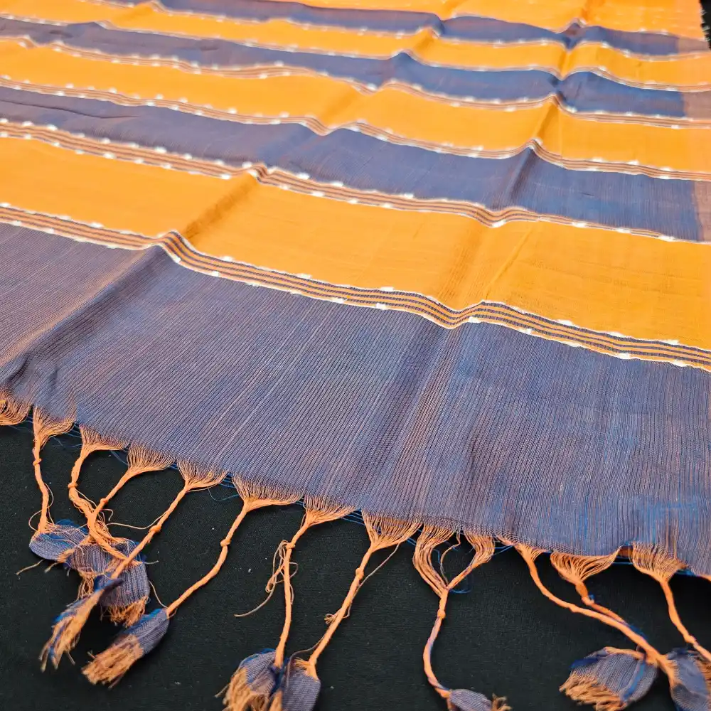 The Orange And Blue Mangalagiri Handloom Silk Cotton Blend Jute Lines Saree, is a perfect fusion of traditional weaving and modern elegance. Crafted with a fine cotton-silk blend, it features distinctive jute line patterns that lend a rich texture and contemporary appeal. Lightweight and graceful, this saree is ideal for festive occasions, formal gatherings, or everyday ethnic elegance.
