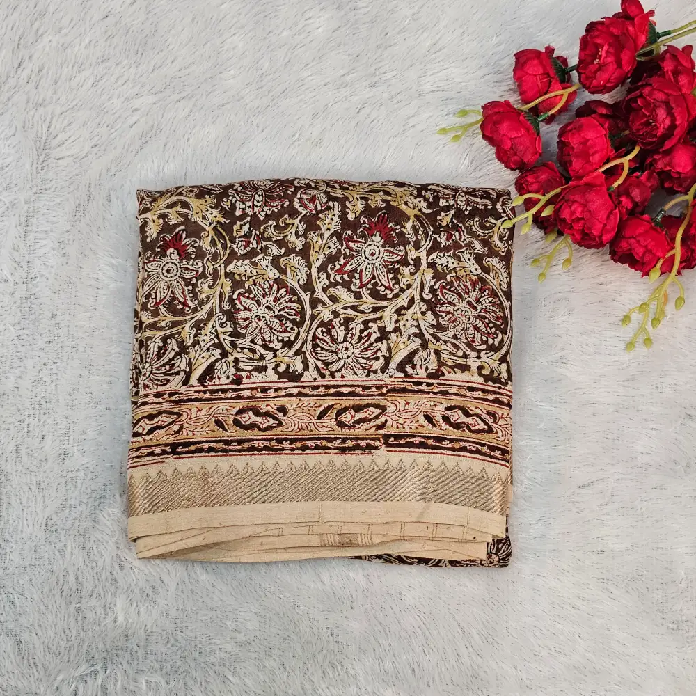 Brown Mangalagiri Handloom Silk Cotton Blend Kalamkari HandBlock Print 50K Border Saree