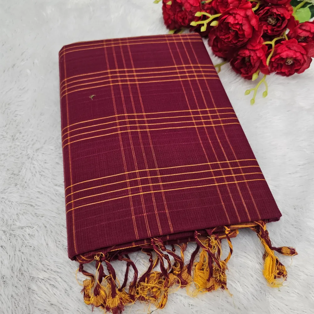 Step into timeless elegance with this Cherry Color Mangalagiri Handloom Cotton Double Checks Saree, a true reflection of traditional South Indian artistry. Handwoven by skilled weavers from Mangalagiri, Andhra Pradesh, this saree features a distinctive Yellow double-checks pattern that adds a refined charm to its lightweight and breathable cotton fabric. Perfect for both everyday grace and festive sophistication, it effortlessly blends comfort, tradition, and style.