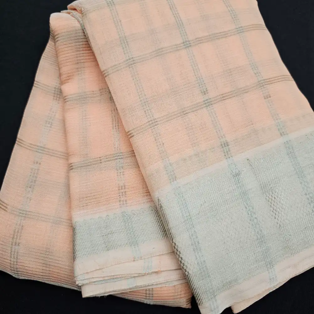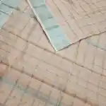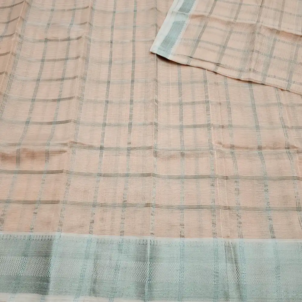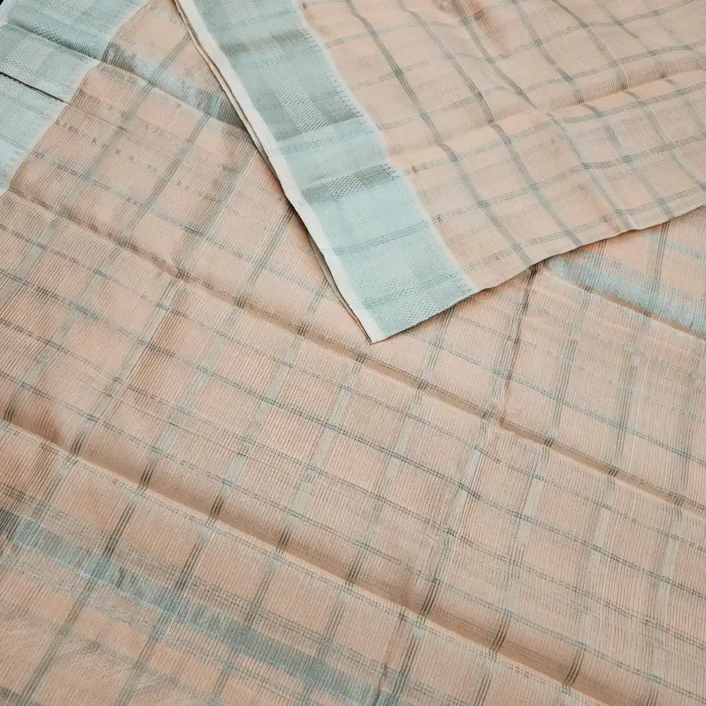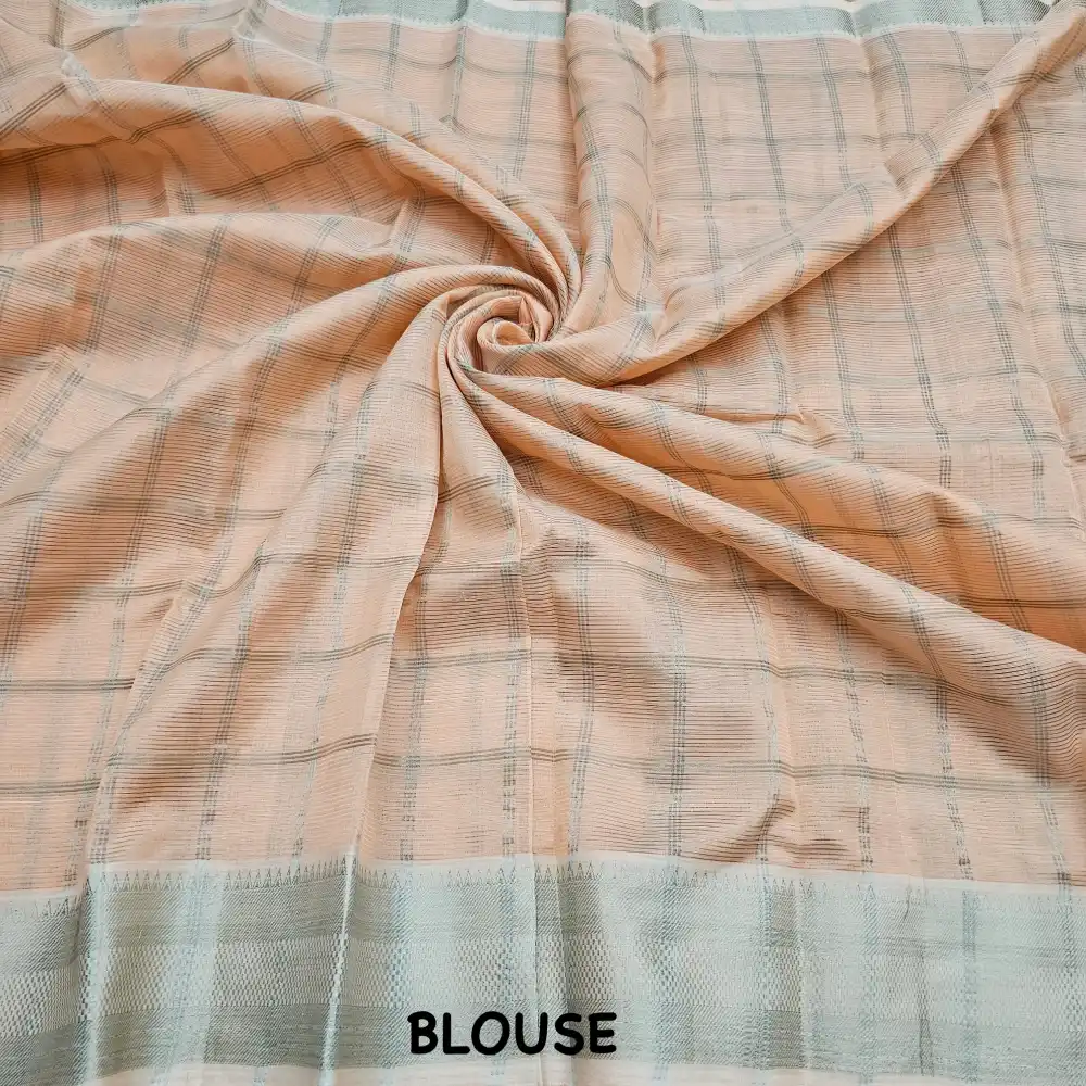 Enhance your ethnic style with this Light peach Mangalagiri Handloom Pure Silk Cotton Blend Checks Saree featuring a graceful 150K Silver zari border. Expertly handwoven by skilled artisans, this saree beautifully combines the lustrous texture of silk with the soft comfort of cotton. The traditional checked pattern adds timeless charm, while the rich zari border brings a touch of sophistication—perfect for festive occasions, traditional ceremonies, and cultural gatherings.