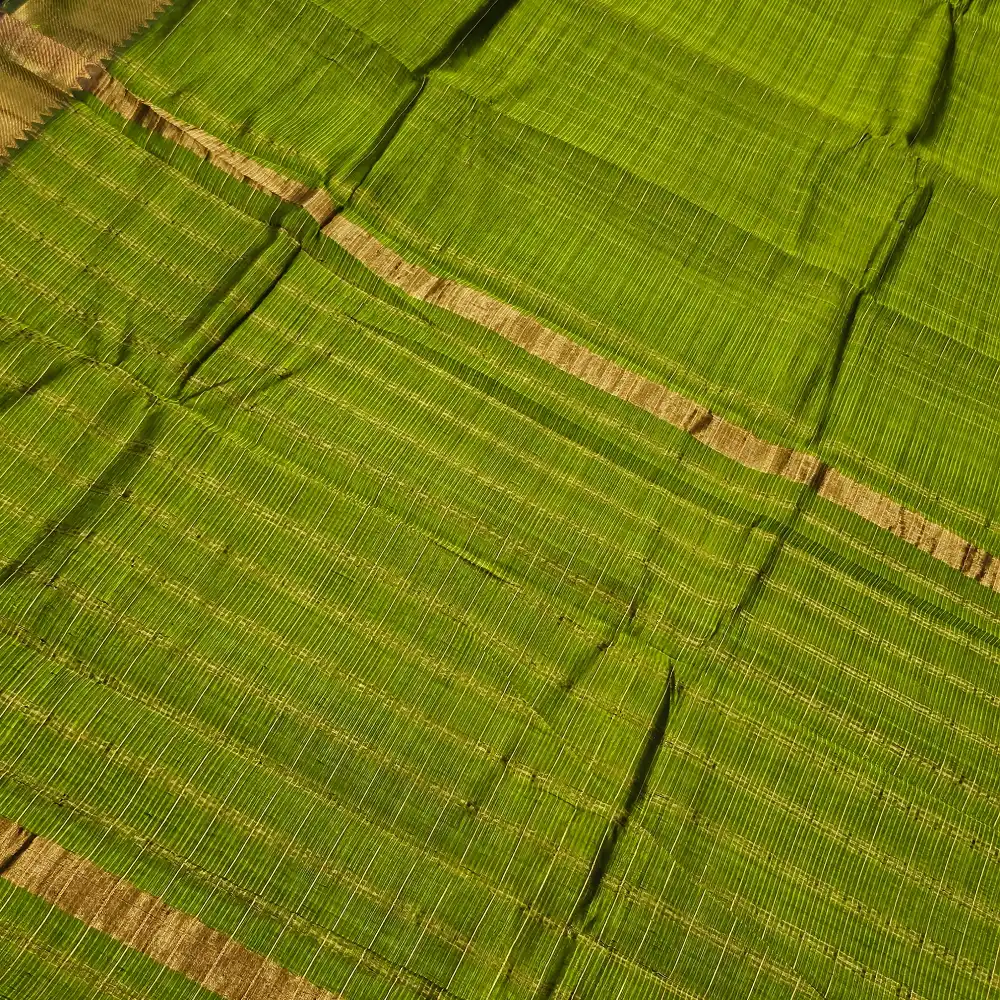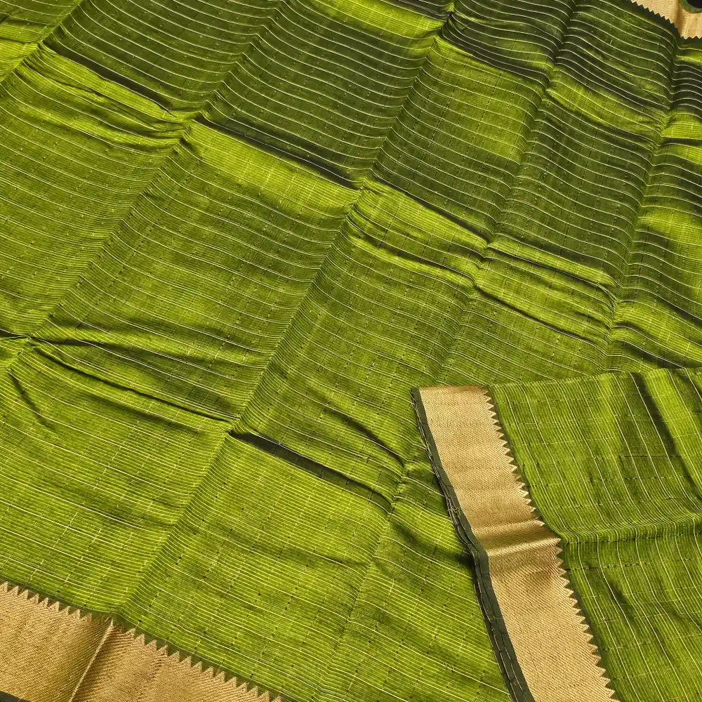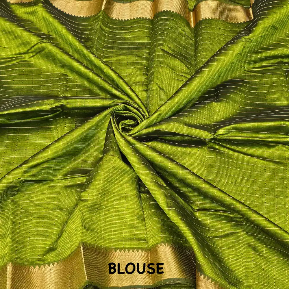 Enhance your ethnic style with this Olive Green Mangalagiri Handloom Pure Silk Cotton Blend Checks Saree featuring a graceful 100K Gold zari border. Expertly handwoven by skilled artisans, this saree beautifully combines the lustrous texture of silk with the soft comfort of cotton. The traditional checked pattern adds timeless charm, while the rich zari border brings a touch of sophistication—perfect for festive occasions, traditional ceremonies, and cultural gatherings.