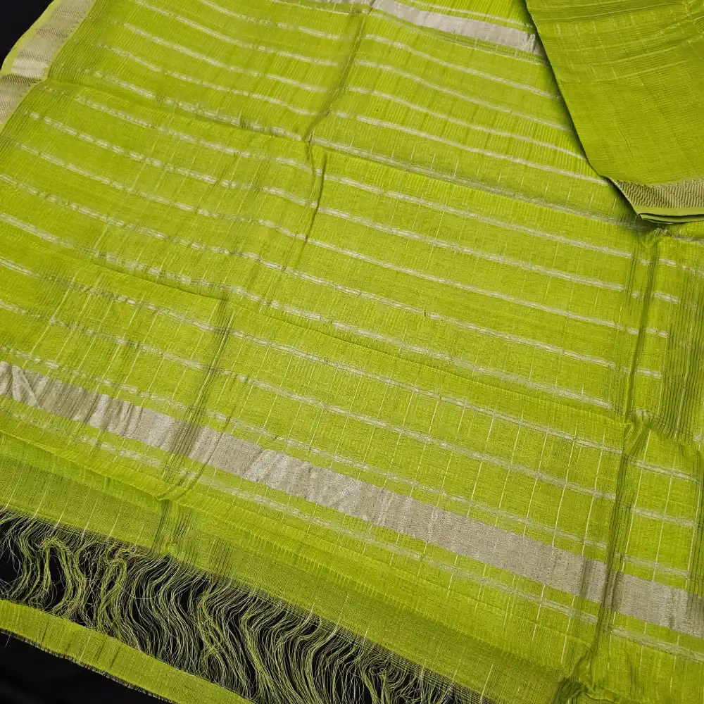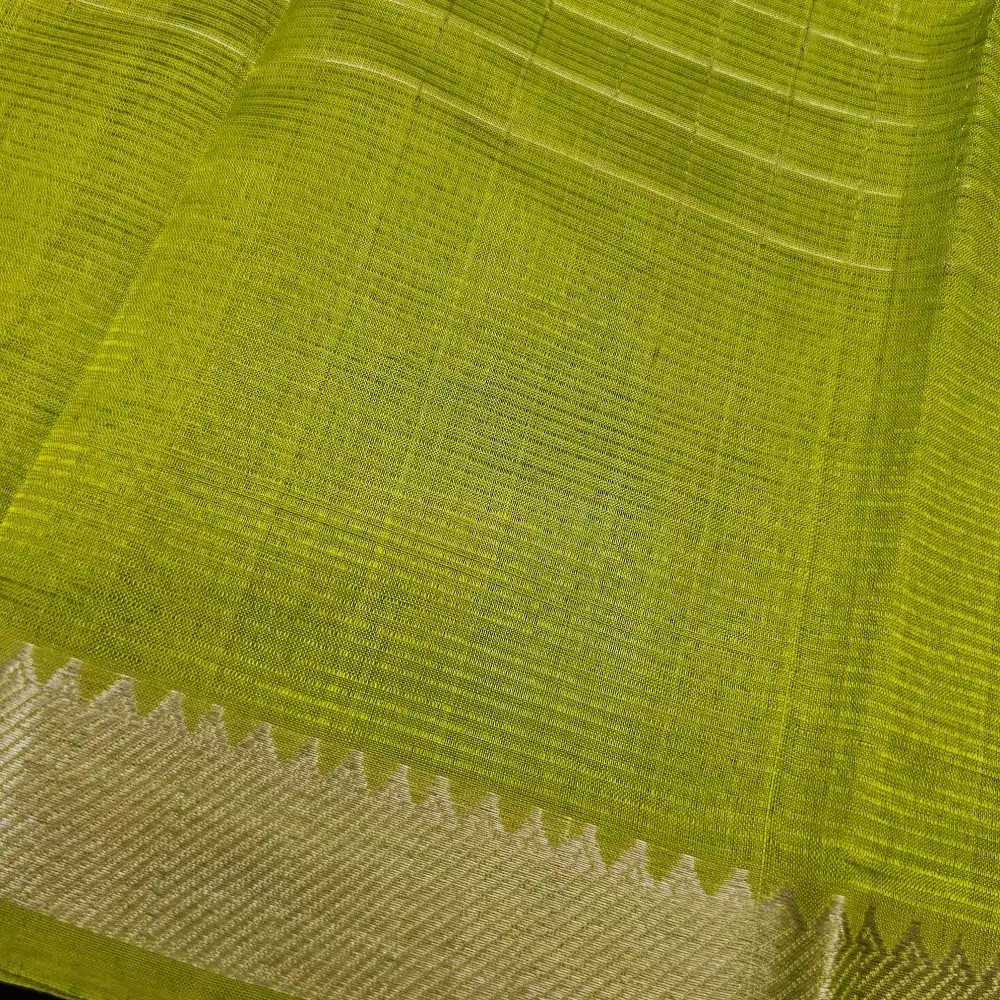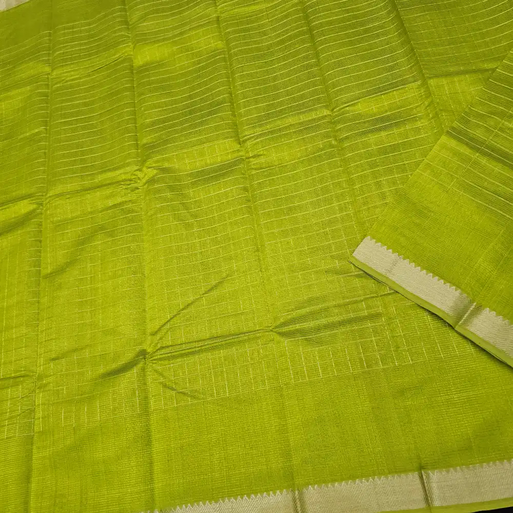 Grace your wardrobe with th is Green Mangalagiri Handloom Pure Silk Cotton Blend Missing Weave Checks Saree featuring a charming gap border with zari Checks. Handwoven by skilled artisans, this saree beautifully merges the richness of silk with the comfort of cotton. The classic checked pattern adds a timeless appeal, while the subtle zari border lends an understated touch of elegance. Perfect for festive gatherings, cultural occasions, and elegant daywear.