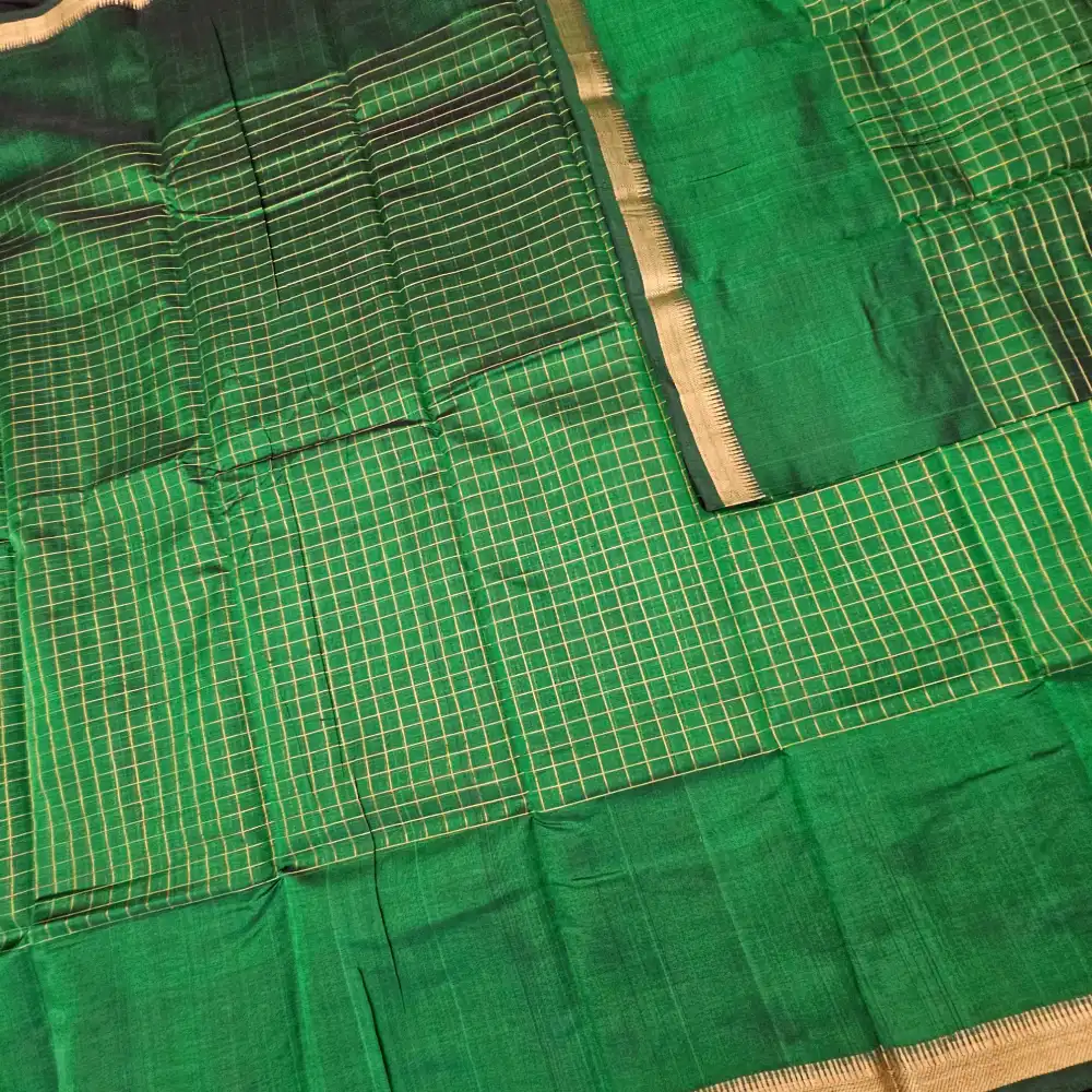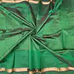 Grace your wardrobe with this Dark Green Mangalagiri Handloom Pure Silk Cotton Blend Thick Weave Checks Saree featuring a charming gap border with zari Checks. Handwoven by skilled artisans, this saree beautifully merges the richness of silk with the comfort of cotton. The classic checked pattern adds a timeless appeal, while the subtle zari border lends an understated touch of elegance. Perfect for festive gatherings, cultural occasions, and elegant daywear.