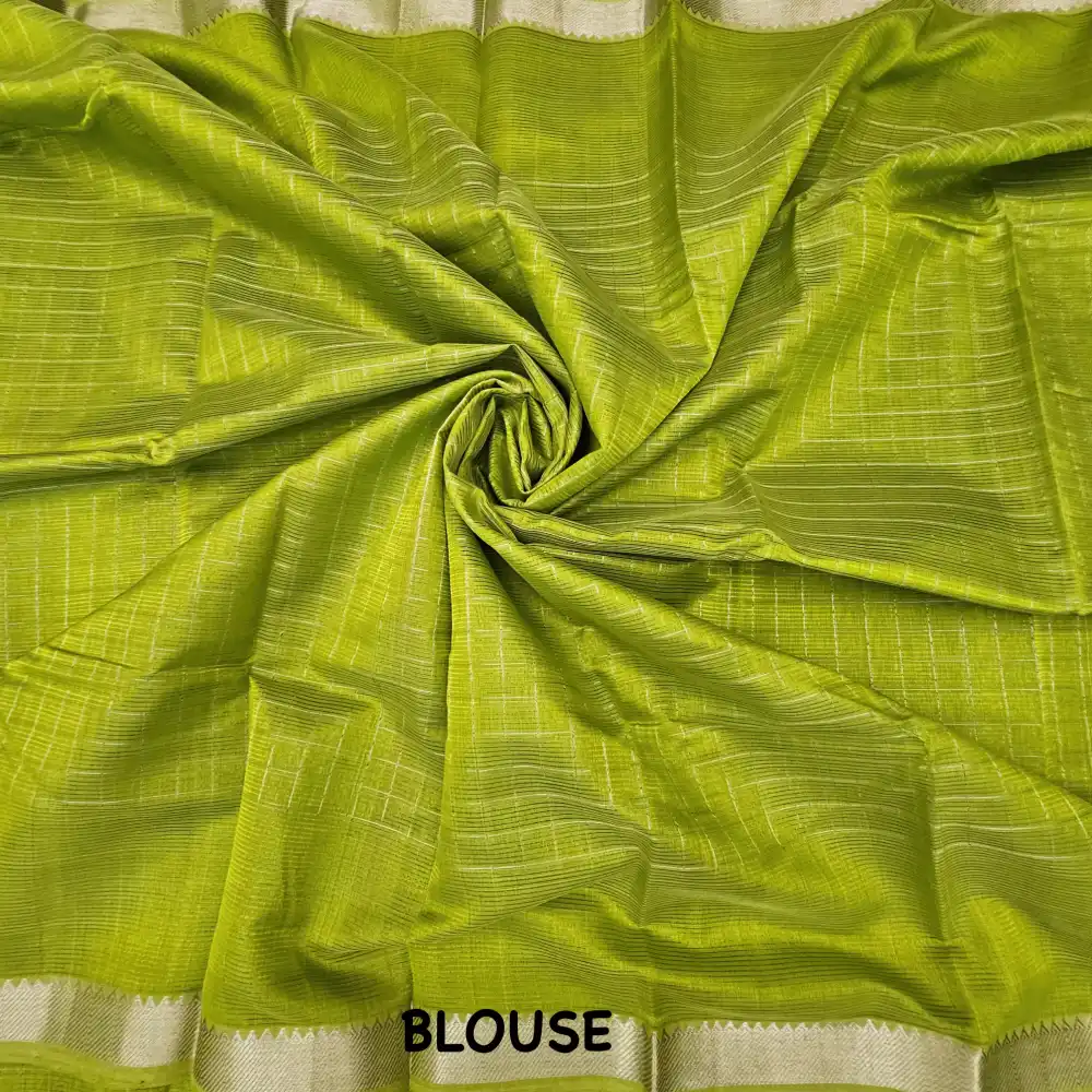Grace your wardrobe with this Parrot Green Mangalagiri Handloom Pure Silk Cotton Blend Missing Weave Checks Saree featuring a charming gap border with zari Checks. Handwoven by skilled artisans, this saree beautifully merges the richness of silk with the comfort of cotton. The classic checked pattern adds a timeless appeal, while the subtle zari border lends an understated touch of elegance. Perfect for festive gatherings, cultural occasions, and elegant daywear.