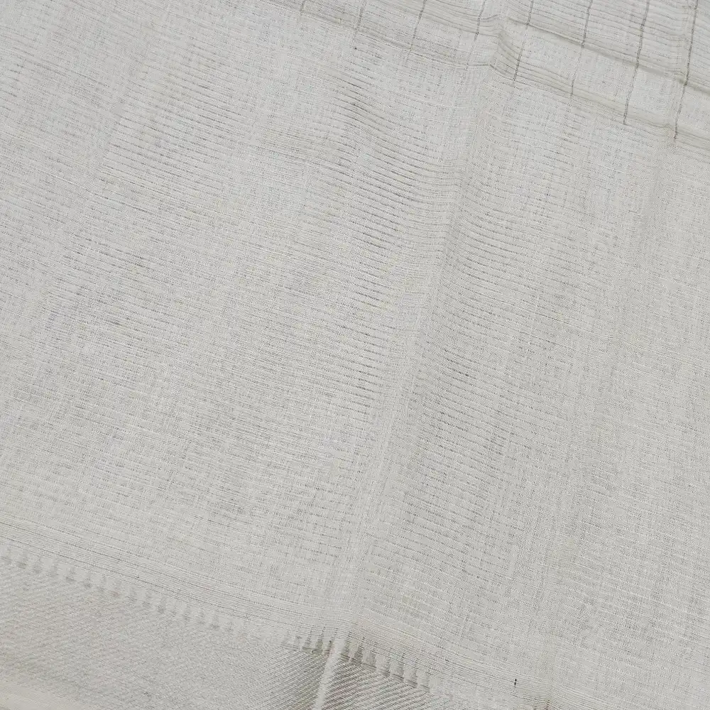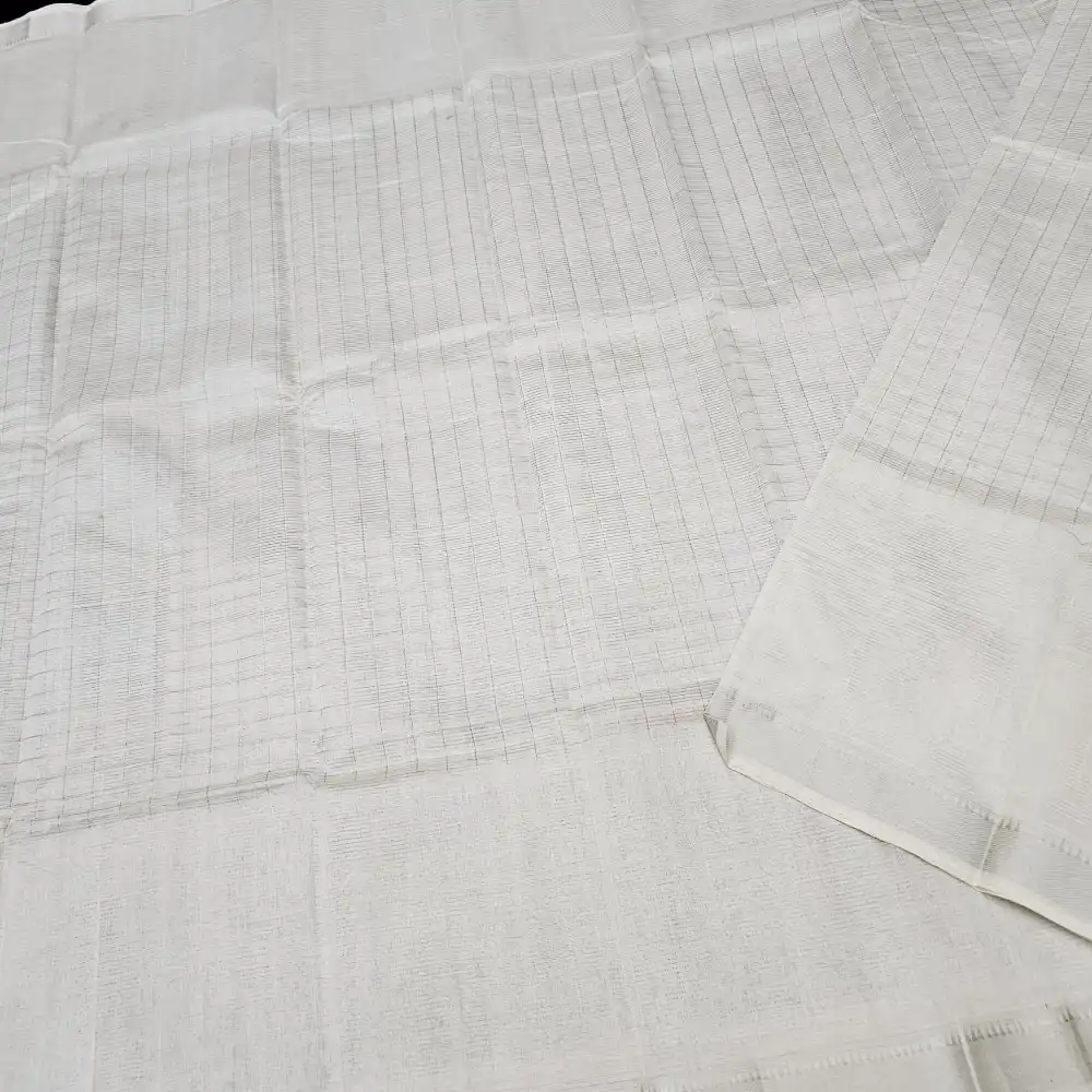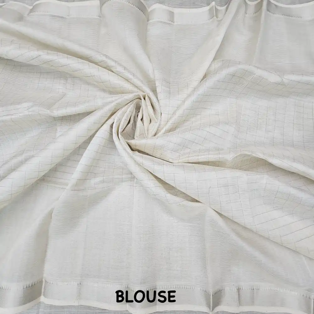 Grace your wardrobe with this PureWhite Mangalagiri Handloom Pure Silk Cotton Blend Missing Weave Checks Saree featuring a charming gap border with zari Checks. Handwoven by skilled artisans, this saree beautifully merges the richness of silk with the comfort of cotton. The classic checked pattern adds a timeless appeal, while the subtle zari border lends an understated touch of elegance. Perfect for festive gatherings, cultural occasions, and elegant daywear.
