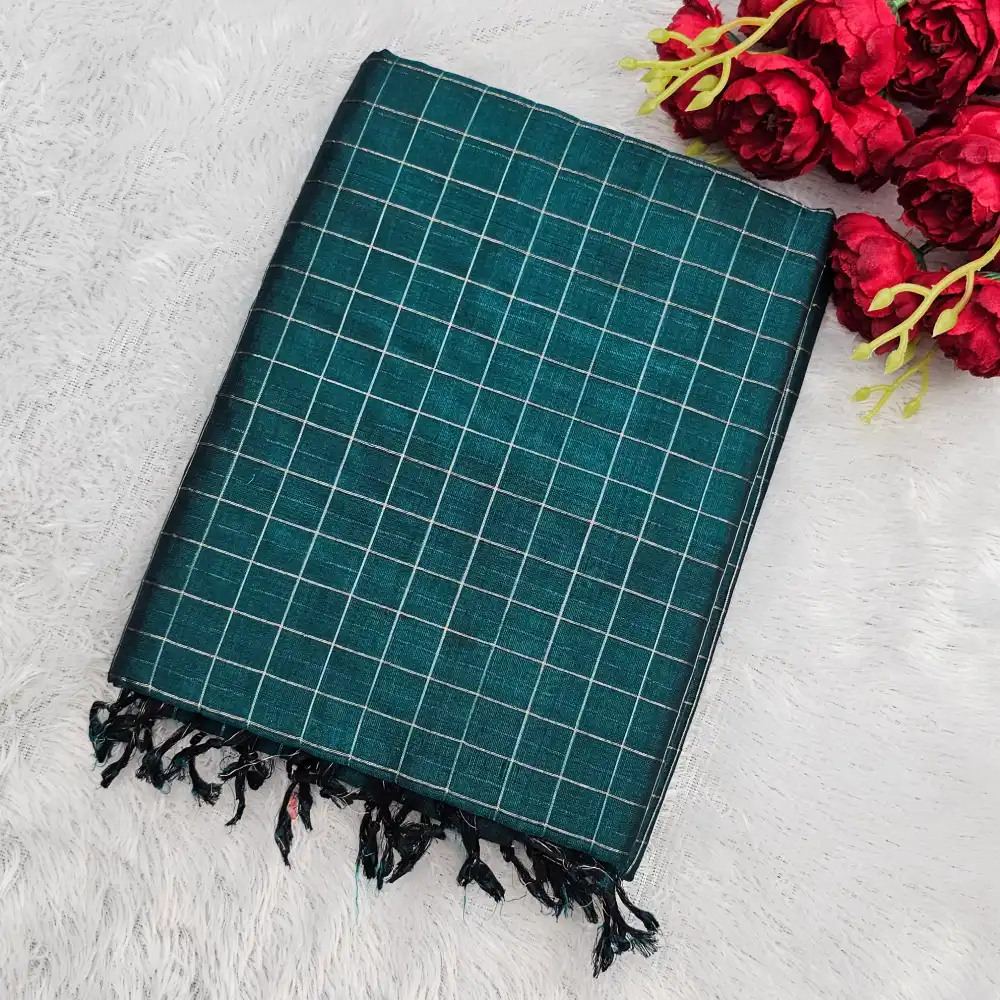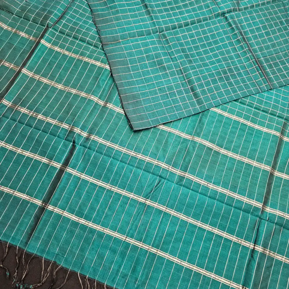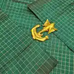 Timeless in appeal and rich in texture, this Dark Green Mangalagiri Cotton-Pure Silk saree features classic Gold Zari checks across a smooth, breathable body. The fusion of fine cotton and pure silk gives the saree a crisp yet soft feel, with a subtle sheen that makes it perfect for both everyday sophistication and festive elegance.