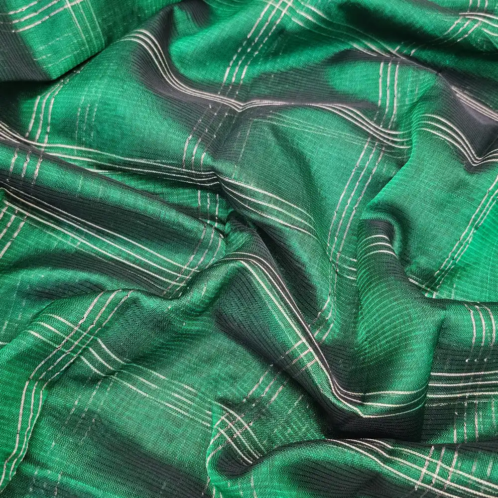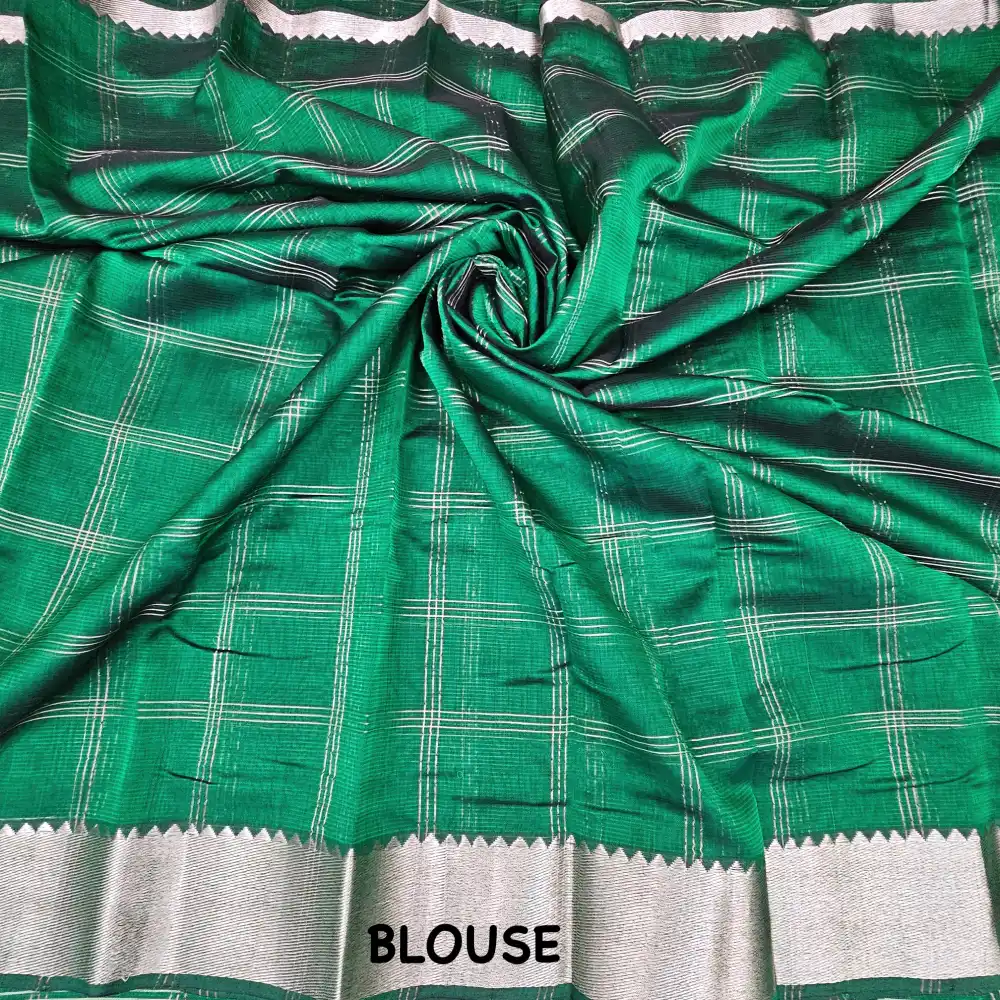 Showcase timeless elegance with this Dark Green Mangalagiri Handloom Silk Cotton Blend Checks Saree featuring a graceful 150K Silver zari border. Handwoven by skilled artisans, this saree blends the subtle sheen of silk with the soft comfort of cotton. The classic checked pattern gives it a traditional charm, while the rich zari border adds a luxurious touch—perfect for festive occasions, weddings, and cultural celebrations.