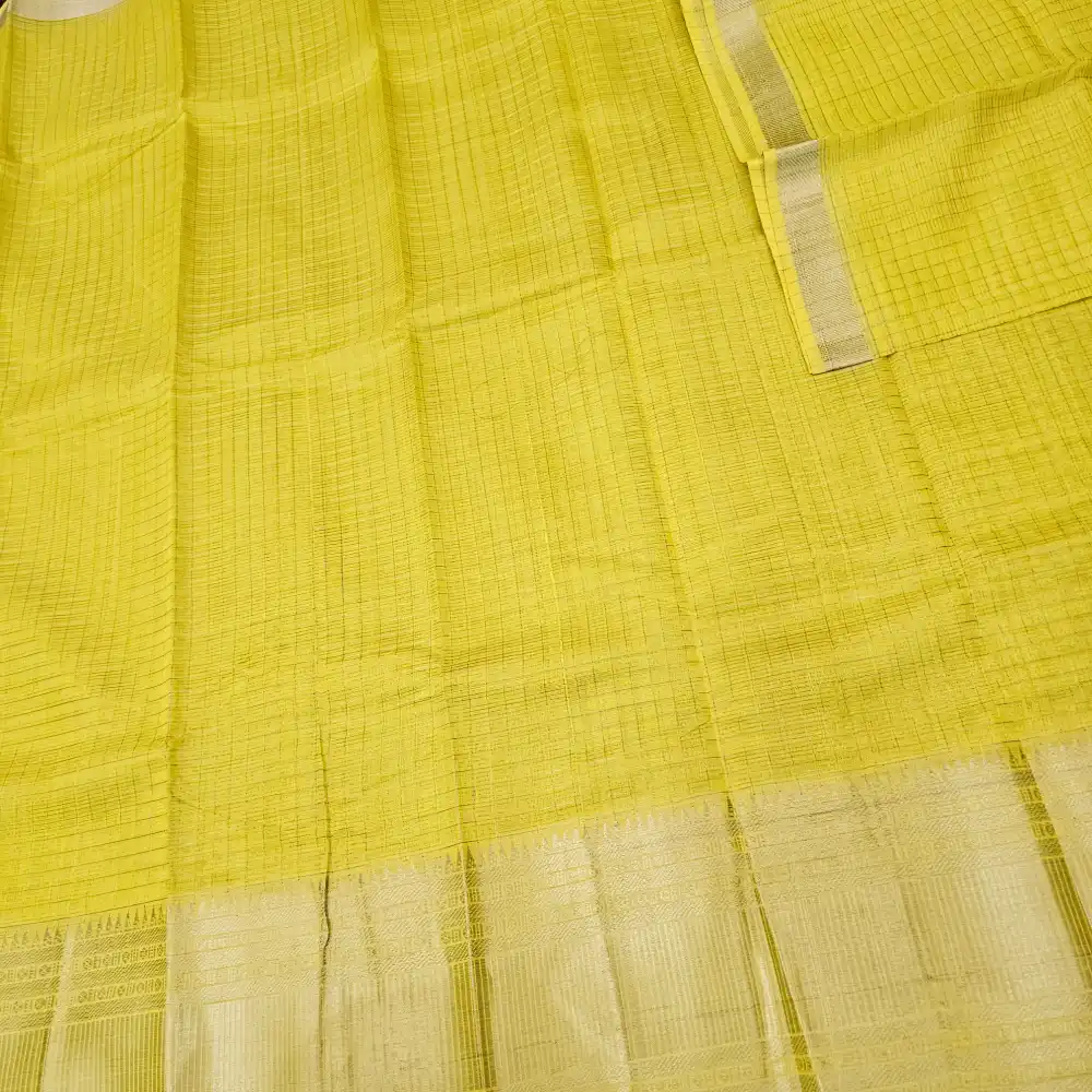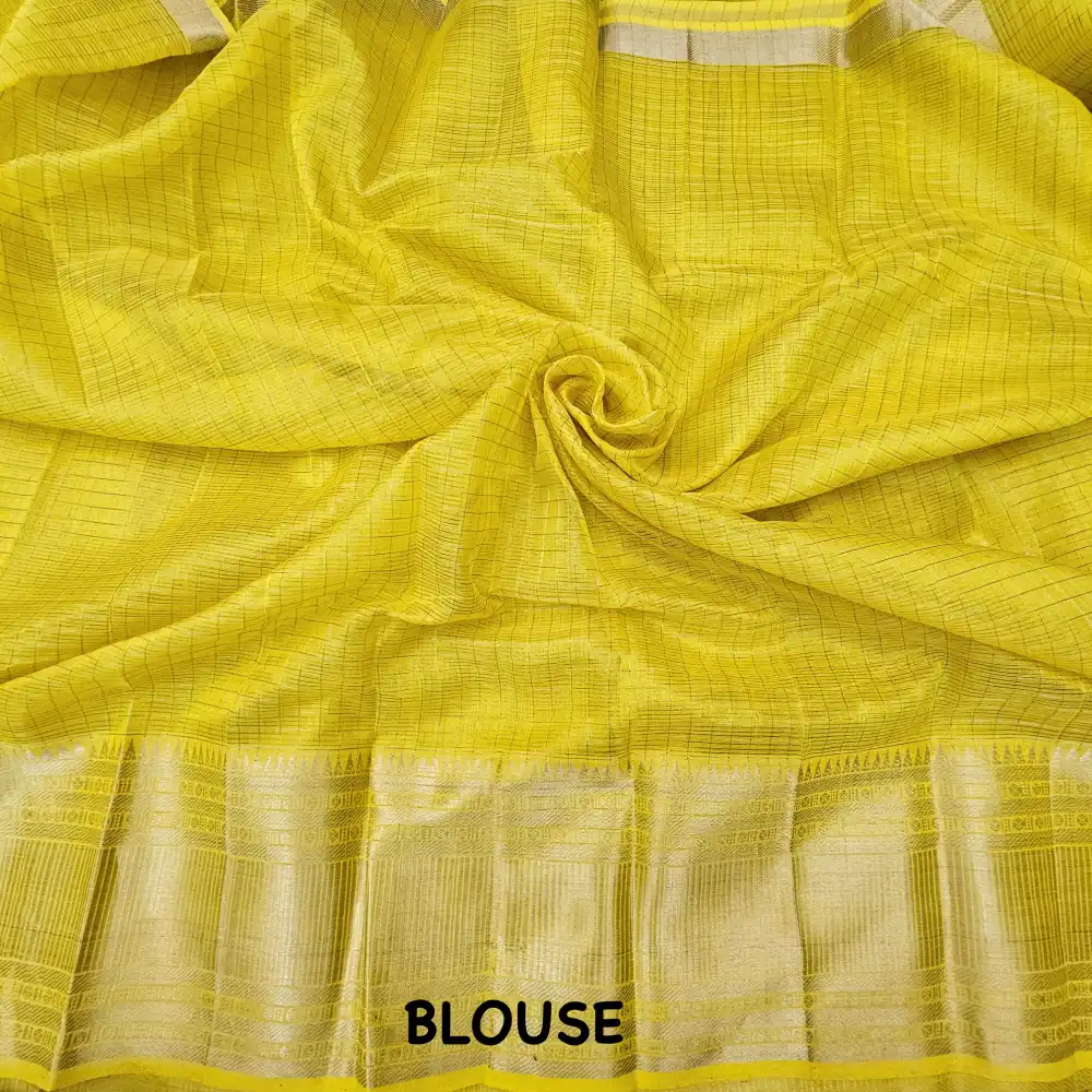 Add a touch of grandeur to your ethnic collection with this Lemon Yellow Mangalagiri Handloom Silk Cotton Blend Checks Saree featuring an exquisite 300K Silver zari big border. Expertly woven on traditional handlooms, this saree beautifully blends the shine of silk with the breathable comfort of cotton. The elegant checked pattern gives it a classic appeal, while the rich zari big border enhances its royal charm—making it an ideal choice for festive occasions, weddings, and cultural celebrations.