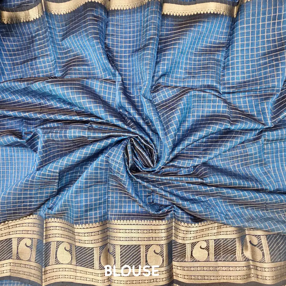 Add a touch of grandeur to your ethnic collection with this Steel Blue Mangalagiri Handloom Pure Silk Cotton Blend Checks Saree featuring an exquisite 300K zari big Kanchi border. Expertly woven on traditional handlooms, this saree beautifully blends the shine of silk with the breathable comfort of cotton. The elegant checked pattern gives it a classic appeal, while the rich zari big border enhances its royal charm—making it an ideal choice for festive occasions, weddings, and cultural celebrations.