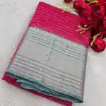Add a touch of grandeur to your ethnic collection with this Dark Rose Pink Mangalagiri Handloom Silk Cotton Blend Checks Saree featuring an exquisite 300K Green Silver zari big border. Expertly woven on traditional handlooms, this saree beautifully blends the shine of silk with the breathable comfort of cotton. The elegant checked pattern gives it a classic appeal, while the rich zari big border enhances its royal charm—making it an ideal choice for festive occasions, weddings, and cultural celebrations.