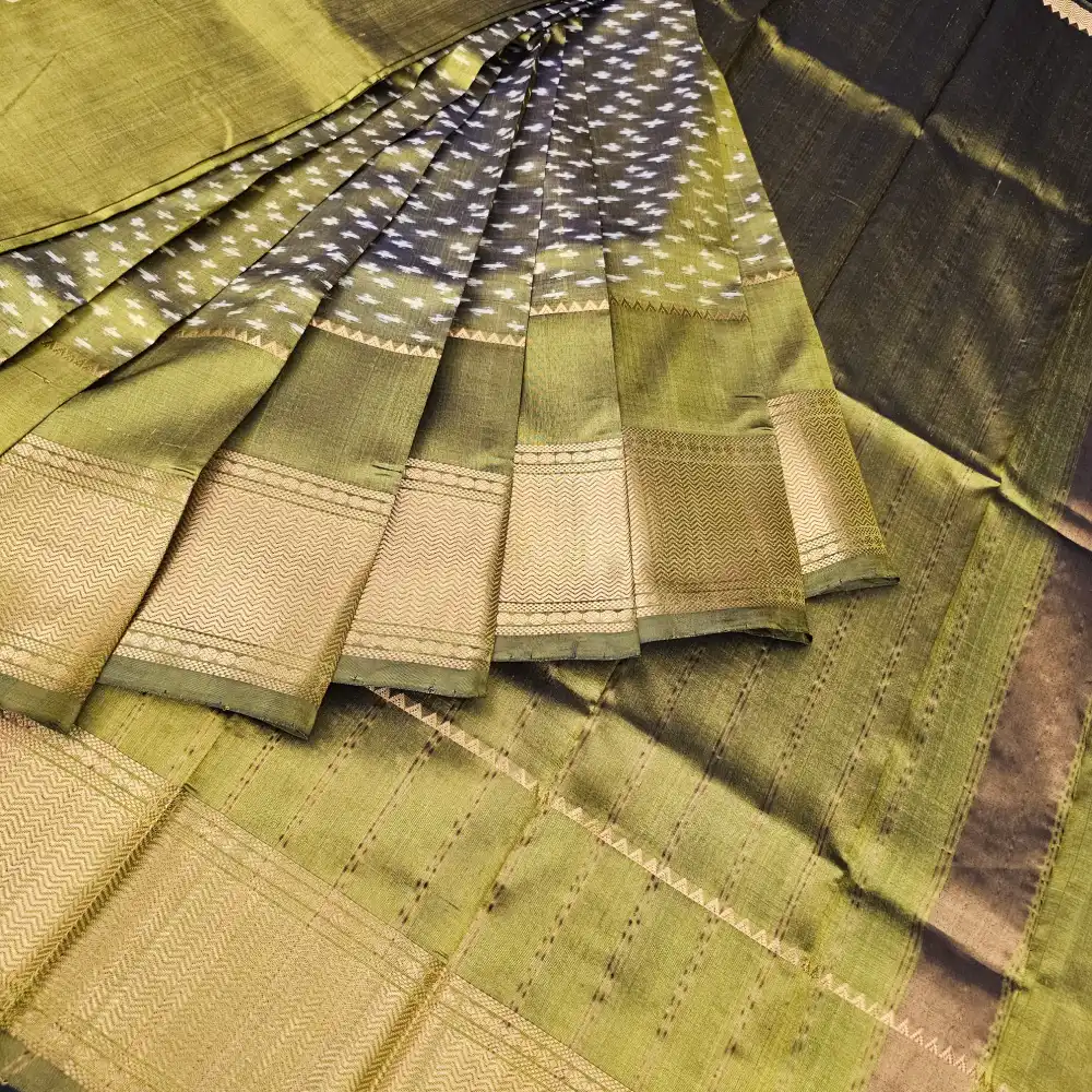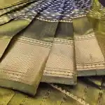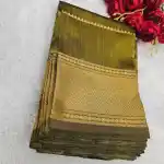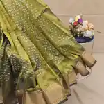 Classic and graceful, this Olive Green Mangalagiri Handloom Pure Silk Saree beautifully blends traditional craftsmanship with understated luxury. The saree body is adorned with white dotted butas, adding a soft contrast to the elegant olive green base. A 250K gold zari border enhances the saree’s richness with a touch of regal shimmer. The saree comes with a running plain blouse in matching olive green and a pallu highlighted with fine gold zari stripes, completing the look with timeless sophistication.