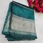 Elegant and refined, this Blue-Green Mangalagiri Handloom Pure Silk Saree perfectly combines traditional craftsmanship with subtle sophistication. The saree body features white dotted butas, adding a delicate contrast against the serene blue-green background. It is beautifully framed with a 250K silver zari border, enhancing its rich and luxurious look. The saree includes a running plain blouse in the same shade and a matching pallu adorned with silver zari stripes, creating a graceful and harmonious finish