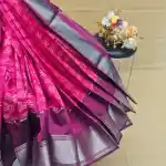 Graceful and timeless, this Rose Pink Mangalagiri Handloom Pure Silk Saree reflects a perfect harmony of elegance and craftsmanship. The saree features white floral butas delicately woven across the rose pink body, giving it a soft and sophisticated appeal. A 250K silver zari border enhances its luxurious charm with a subtle metallic sheen. The pallu and blouse are in deep maroon, providing a rich contrast — with the pallu highlighted by elegant silver zari stripes, completing the saree’s refined and classic look.