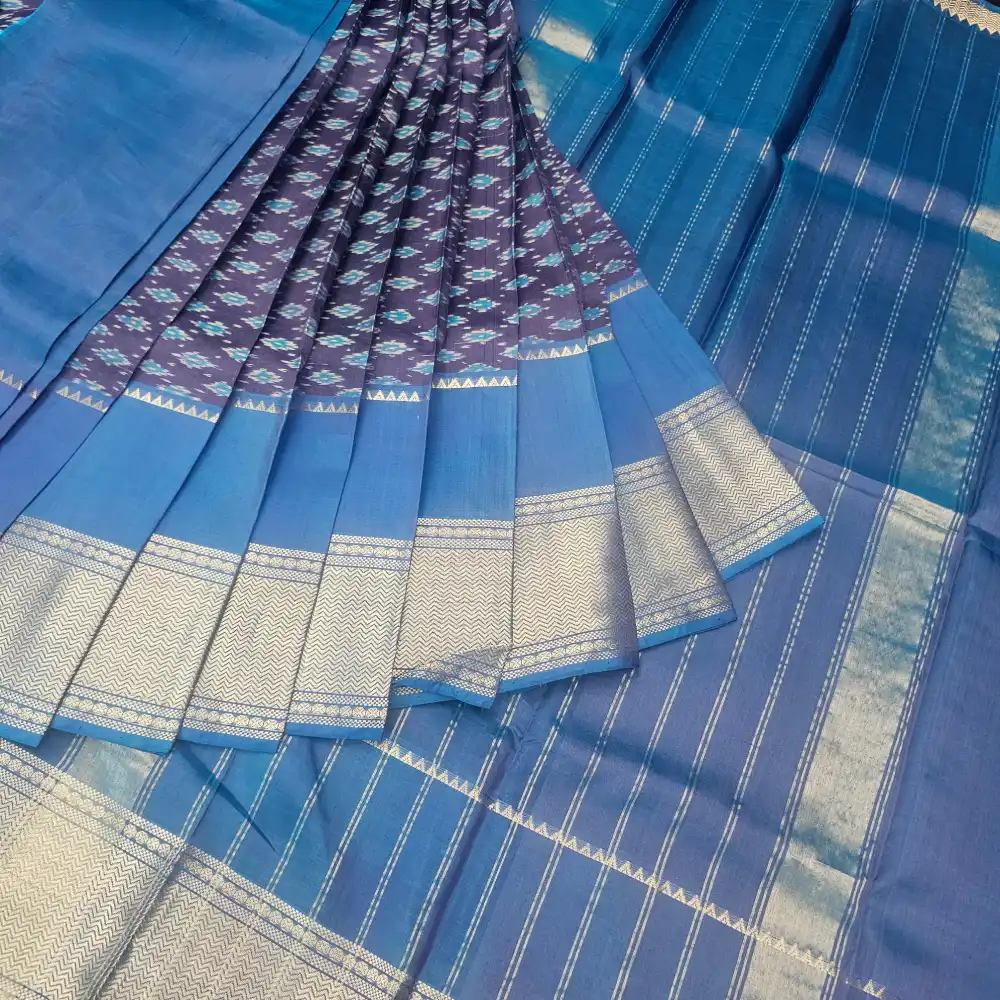 Elegant and regal, this Purple Mangalagiri Handloom Pure Silk Saree showcases a perfect blend of traditional craftsmanship and refined beauty. The saree body is adorned with blue oval-shaped motifs, intricately woven to add depth and charm. It features a 250K silver zari border, lending a luxurious touch to the rich purple base. The pallu and blouse come in a plain blue color, with the pallu highlighted by delicate silver zari stripes, giving the saree a graceful and coordinated finish.