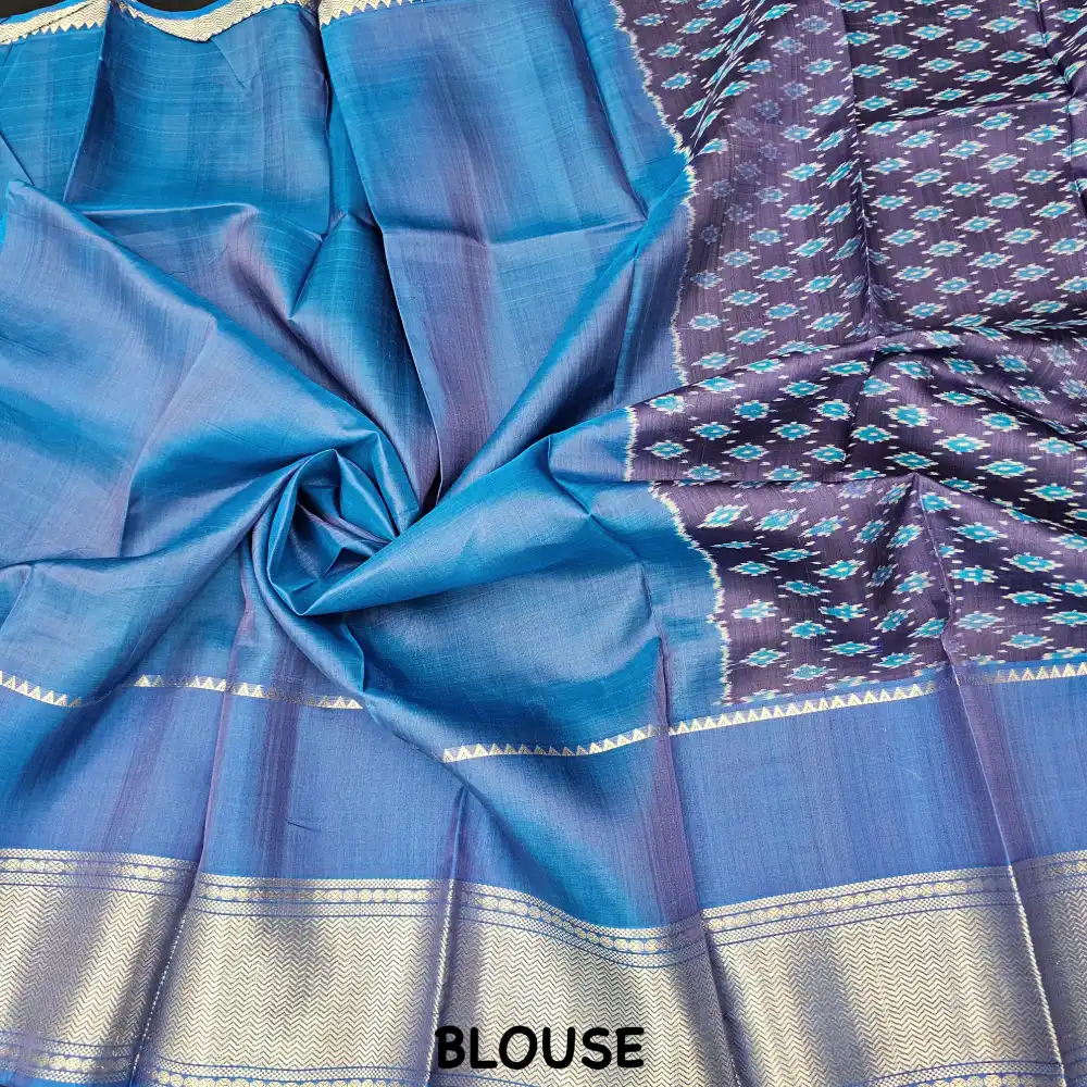 Contrasting blue pallu and blouse with silver zari detailing