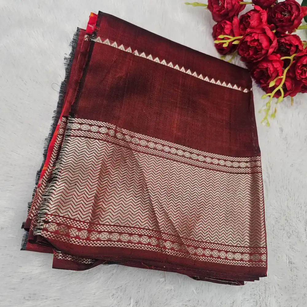 Rich and elegant, this Dark Red Mangalagiri Handloom Pure Silk Saree is woven from premium silk, offering a luxurious sheen and smooth drape. The saree body is adorned with delicate butas, creating a timeless and graceful design. The blouse and pallu come in a deep maroon shade, enhanced with silver zari stripes for a subtle shimmer, giving the saree a beautifully coordinated and regal finish.