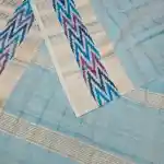 Refreshing and elegant, this Sky Blue Mangalagiri Handloom Saree is crafted from a pure silk cotton blend, offering a smooth texture with a subtle sheen. The saree is adorned with silver zari checks throughout, adding a graceful shimmer to the soothing blue tone. Its Ikkat border in purple and blue combination brings a stylish and traditional contrast. The pallu and blouse come in a running design with matching silver zari checks and Ikkat border, creating a perfectly coordinated and timeless look.