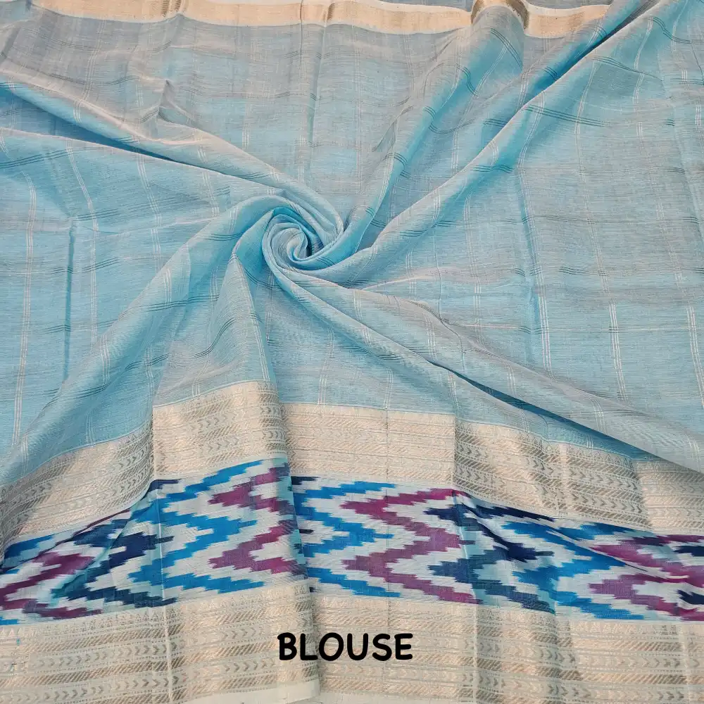 Sky-Blue Mangalagiri Handloom Pure Silk Cotton Blend Checks With Ikkath Border Saree