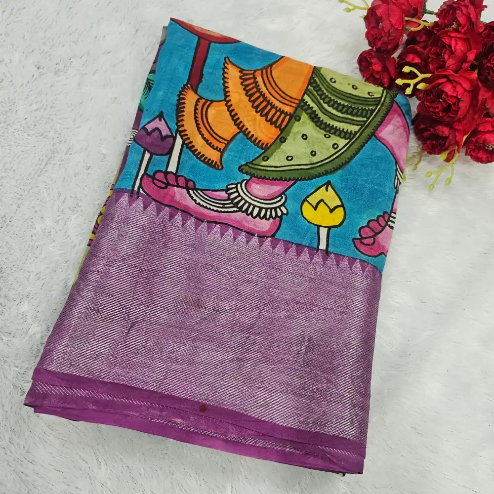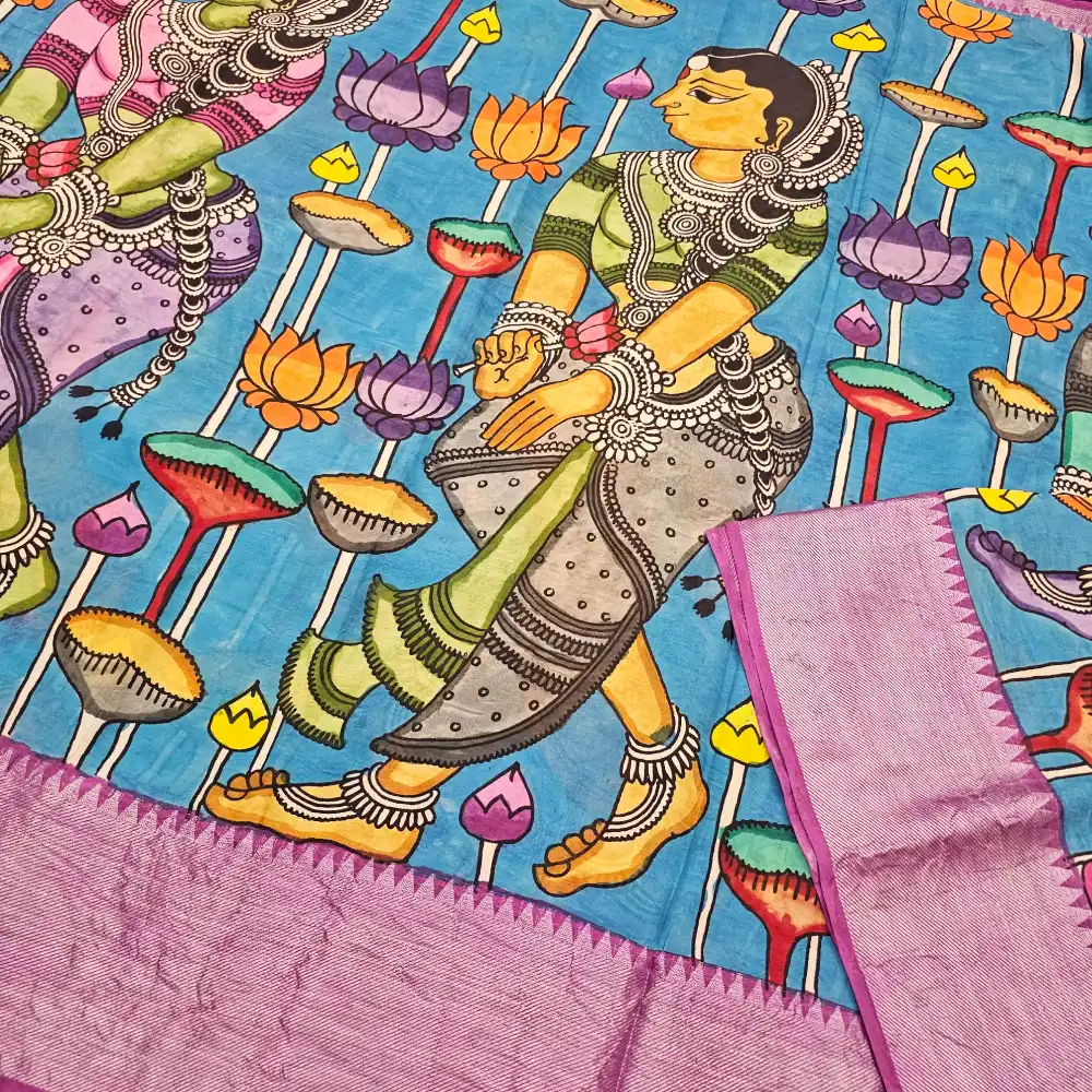 Blue Mangalagiri Handloom silk cotton blend pen kalamakari saree