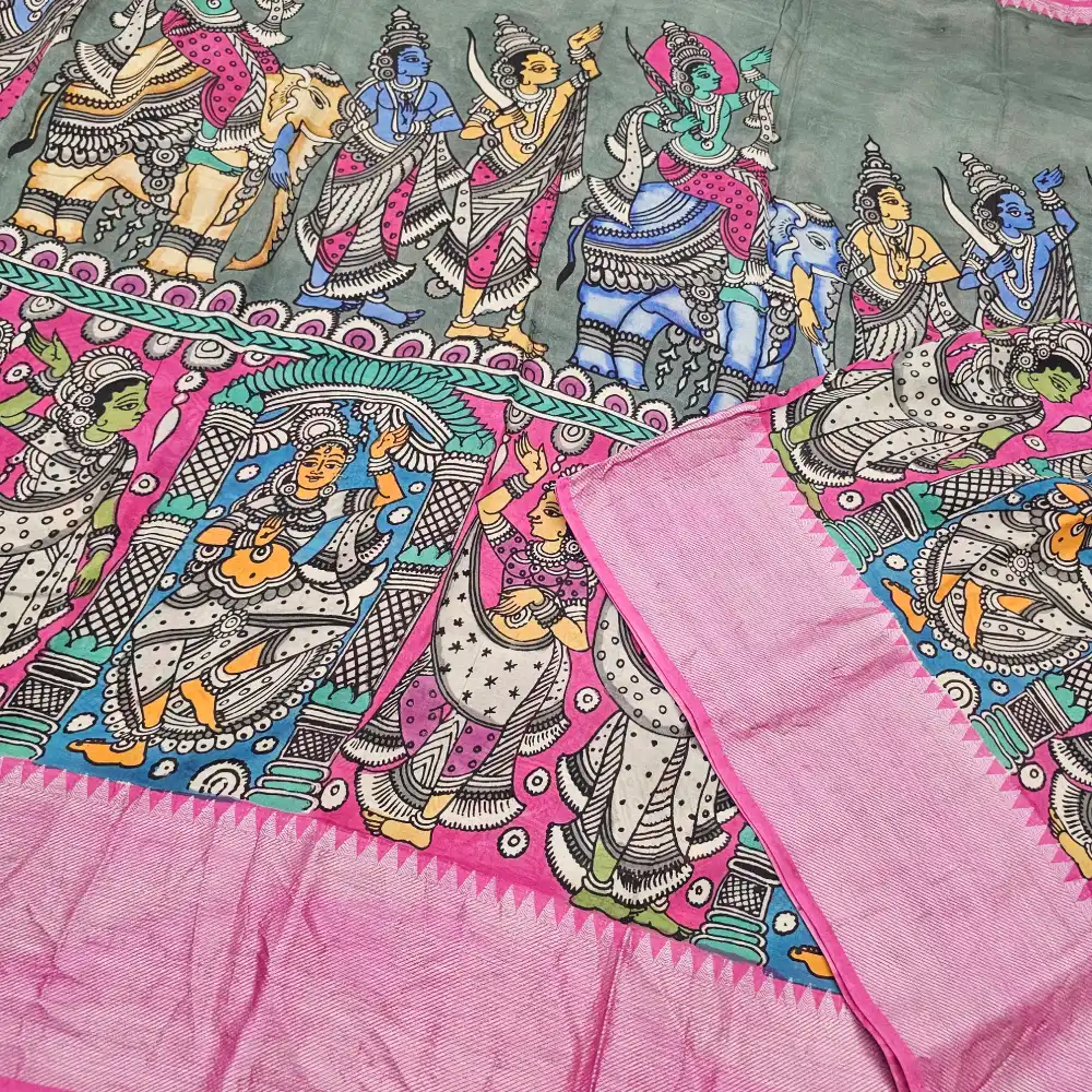Gray Mangalagiri Handloom silk cotton blend pen kalamakari saree