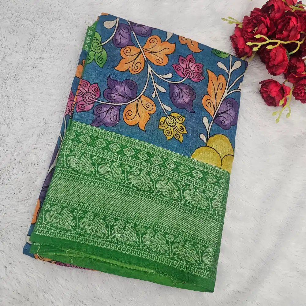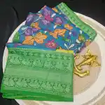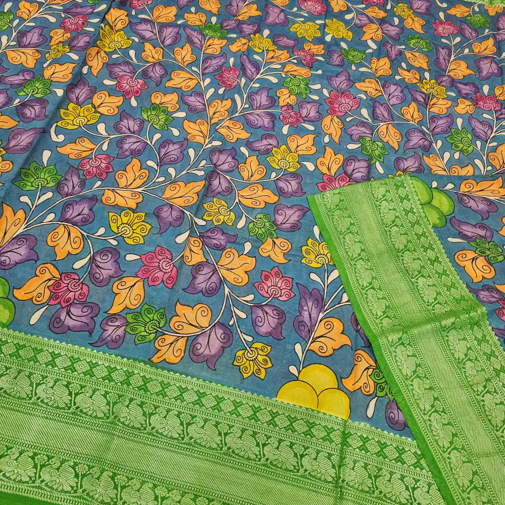 This stunning peacock green Mangalagiri silk cotton blend saree showcases the elegance of Pen Kalamkari art, admired for its detailed hand-painted motifs and traditional craftsmanship. The saree’s body features intricate floral designs, bringing out a perfect blend of artistry and cultural heritage.