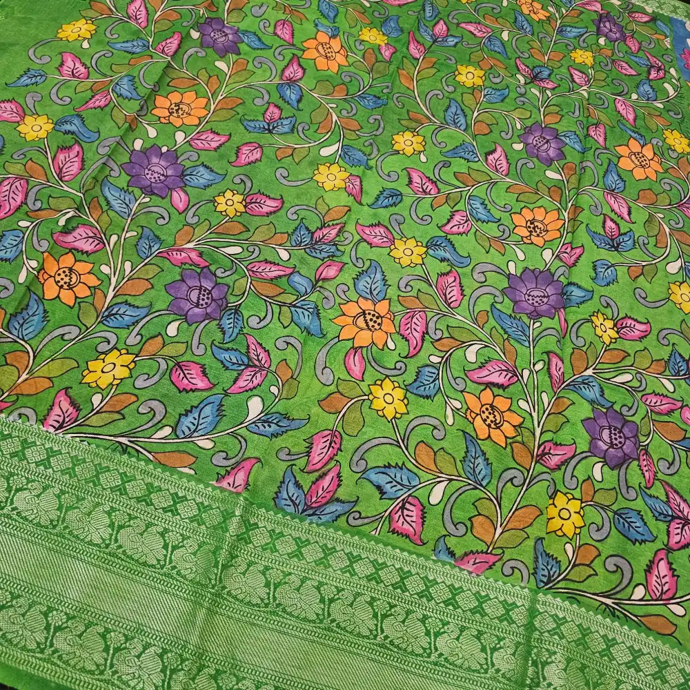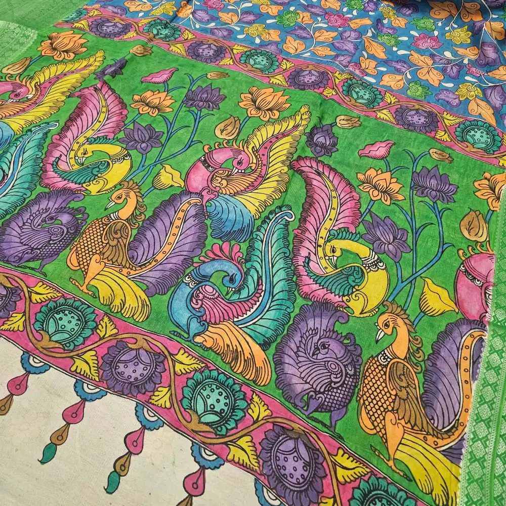 Hand-painted Pen Kalamkari floral and peacock motifs
