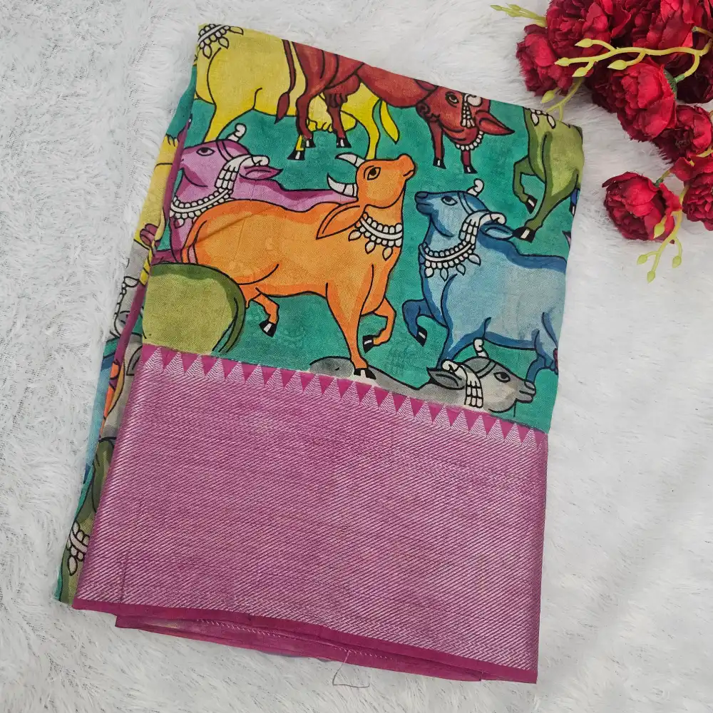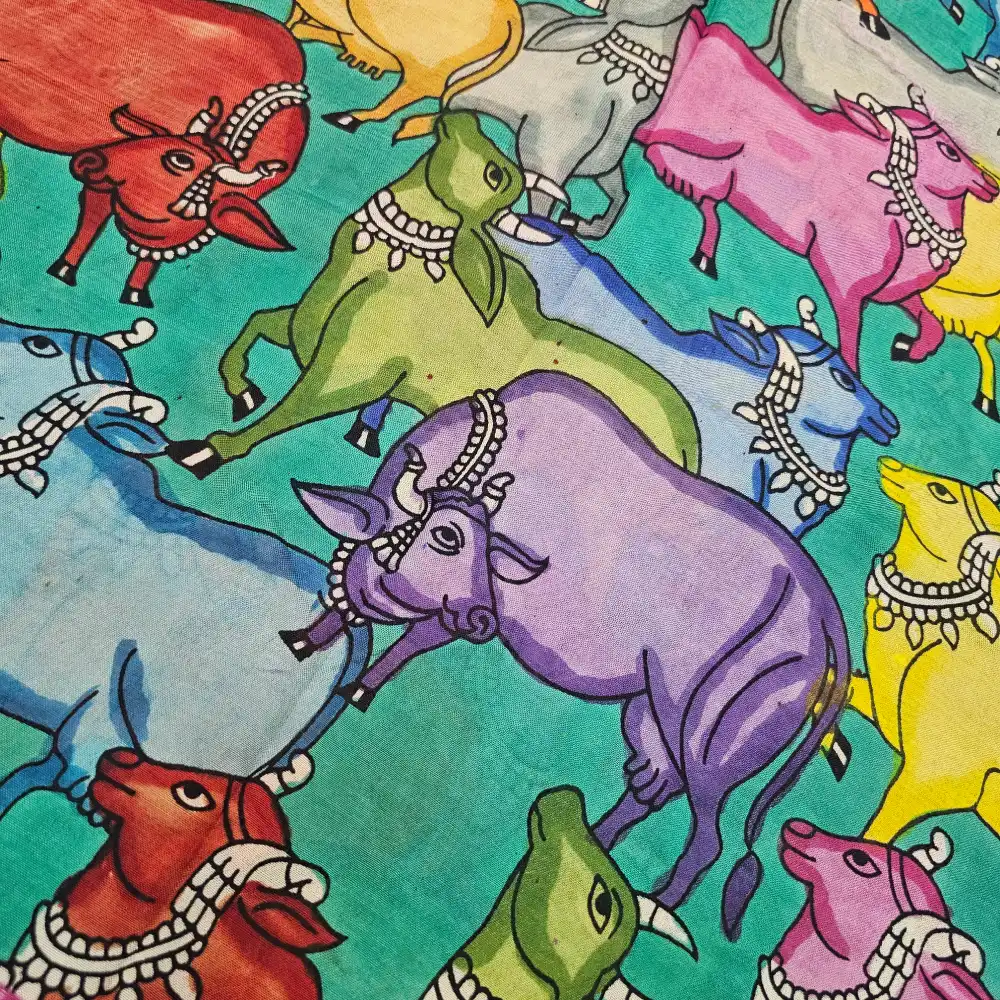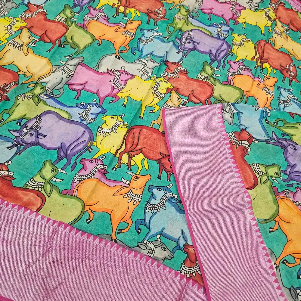 This stunning emerald green Mangalagiri silk cotton blend saree celebrates the beauty of Pen Kalamkari art, known for its hand-drawn and hand-painted motifs inspired by Indian heritage. The saree features vibrant and colorful cow designs intricately painted across the body, showcasing the essence of traditional village artistry.