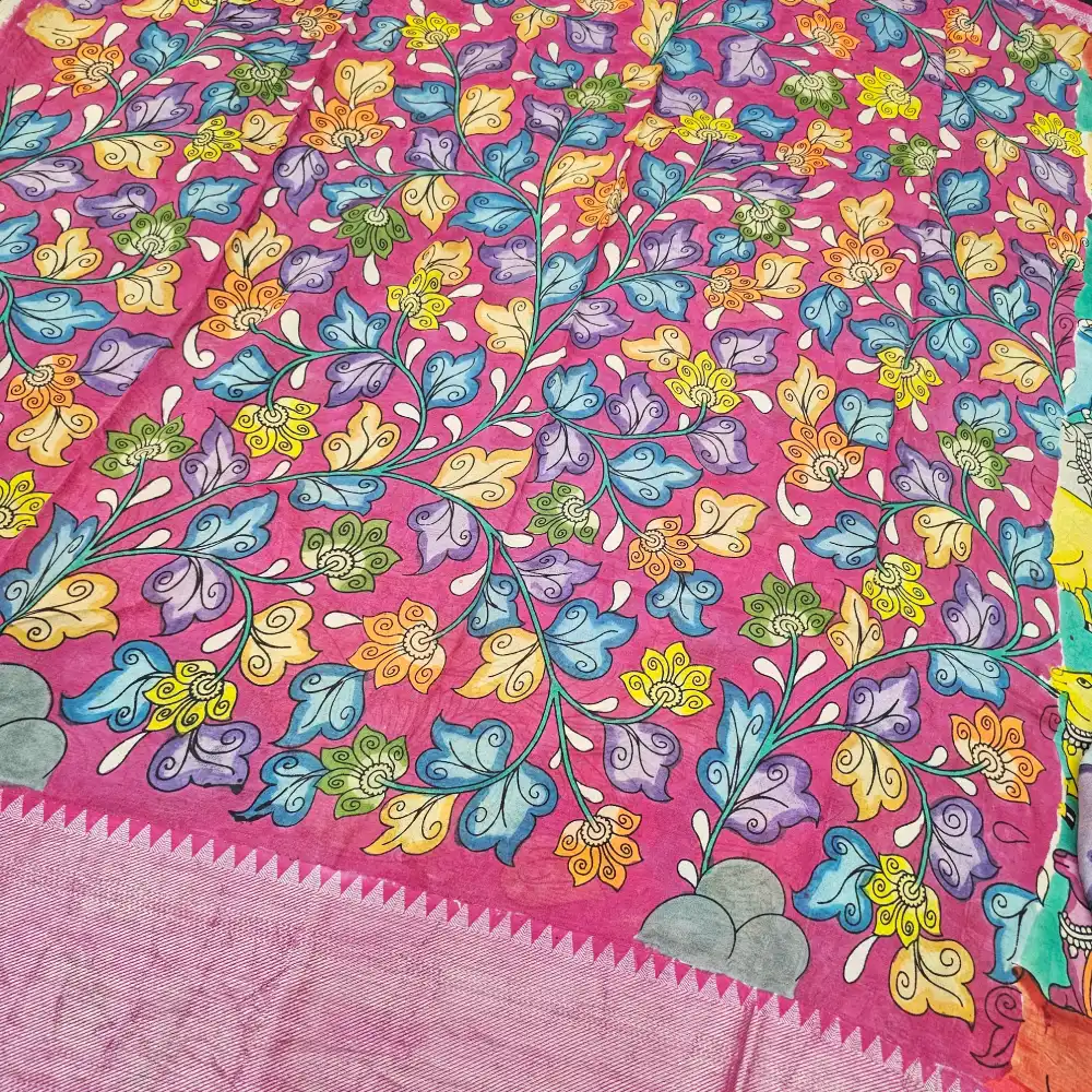 Traditional Pen Kalamkari artistry on fine Mangalagiri weave